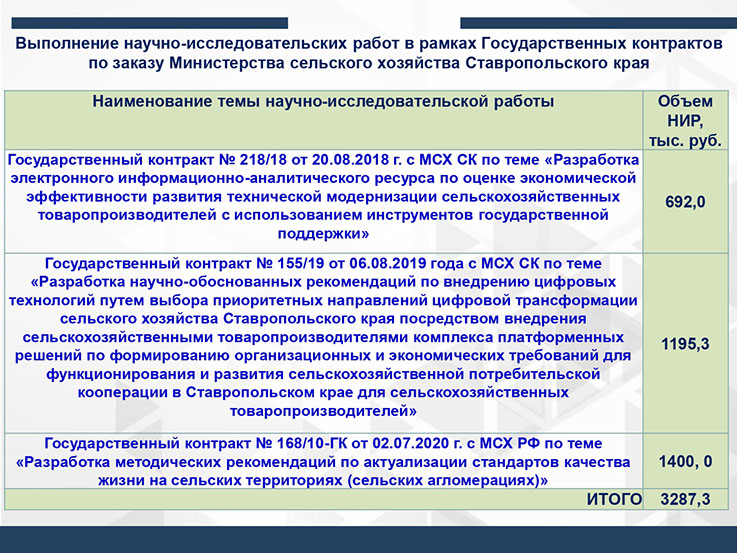 Государственный контракт № 155/19 от 06.08.2019 года с МСХ СК по теме «Разработка научно-обоснованных рекомендаций по внедрению цифровых технологий путем выбора приоритетных направлений цифровой трансформации сельского хозяйства Ставропольского края посредством внедрения сельскохозяйственными товаропроизводителями комплекса платформенных решений по формированию организационных и экономических требований для функционирования и развития сельскохозяйственной потребительской кооперации в Ставропольском крае для сельскохозяйственных товаропроизводителей». Сумма контракта 17 450 000 руб.