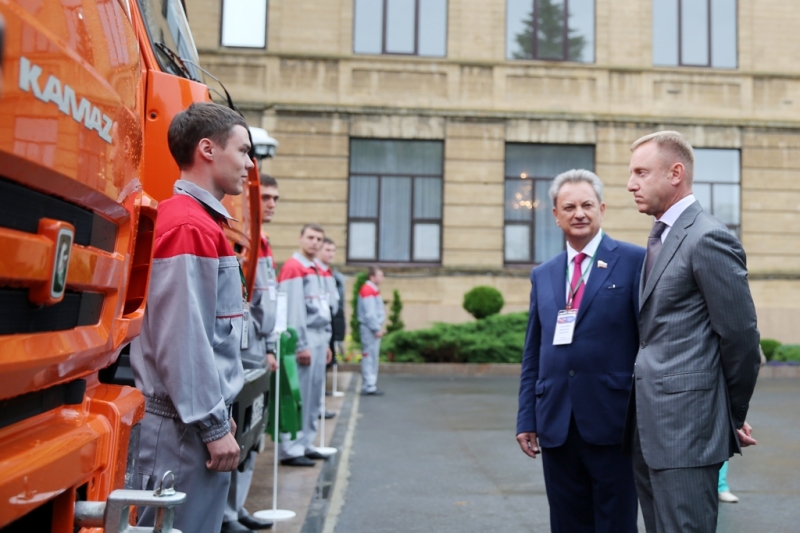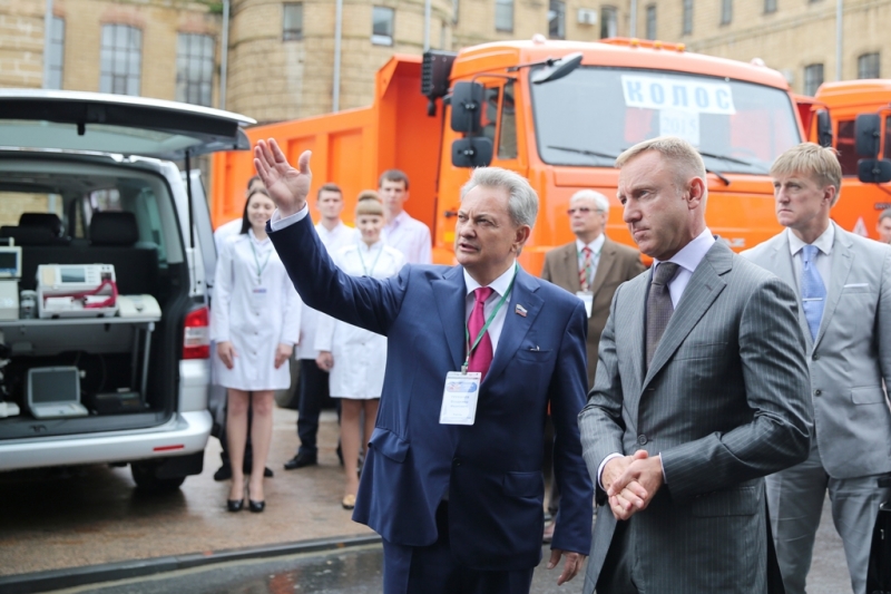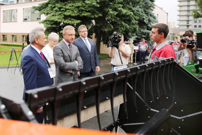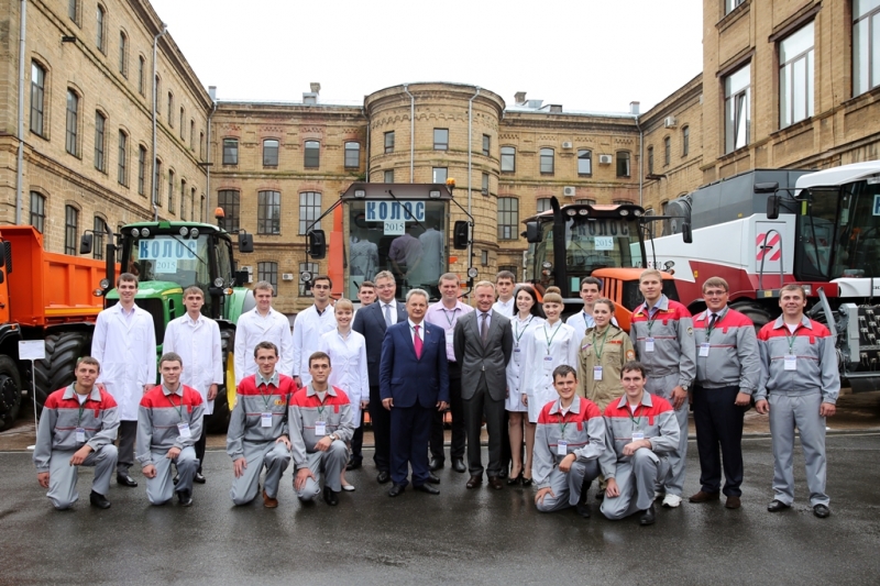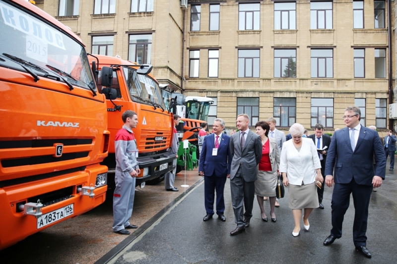 Начался визит со знакомства с выставкой сельхозтехники. Студенты факультета механизации сельского хозяйства с гордостью продемонстрировали министру комбайн, самоходный опрыскиватель, тракторы, Камазы, на которых они во время практики работают в учебно-опытном хозяйстве вуза. К слову, вся эта техника произведена в России. Так комбайн Террион, который студенческому отряду СтГАУ как лучшему в России подарило министерство сельского хозяйства России, собран в Тамбове.