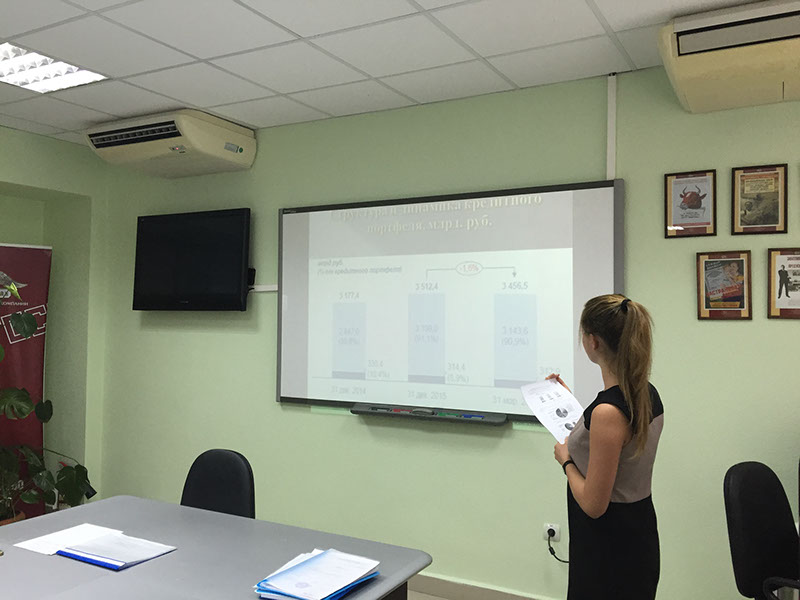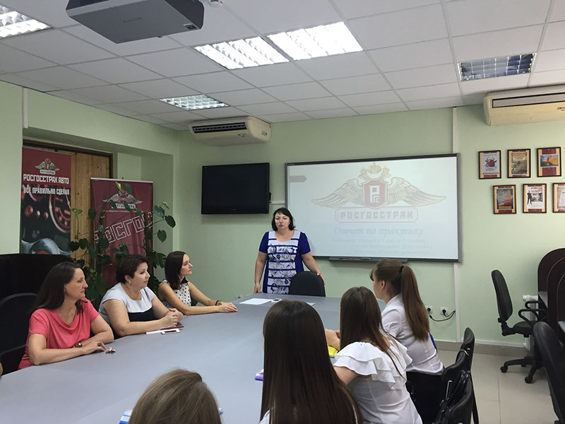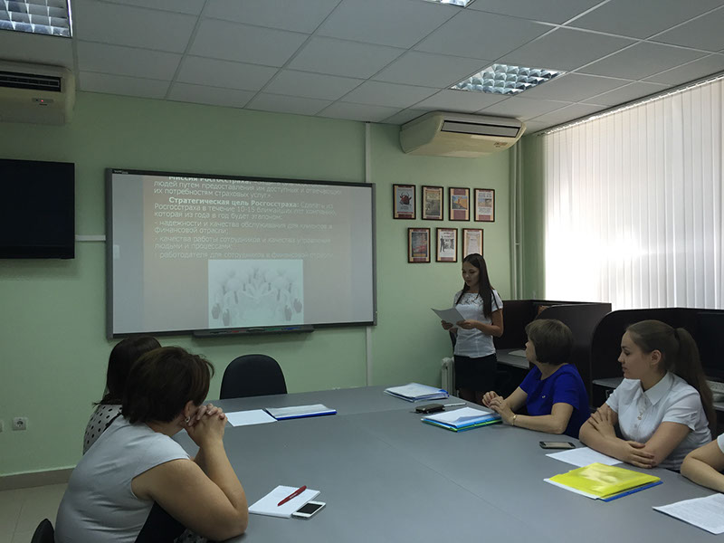 Открытая защита отчетов по производственной практике совместно с представителями филиала ПАО «Росгосстрах» в Ставропольском крае – заместителем директора по работе с персоналом Овчаренко Анной Петровной и начальником отдела продаж корпоративным клиентам Соболевой Ольгой Николаевной, а также финансовой компании «Финам» – заместителем директора по продажам Володиным Михаилом Александровичем.