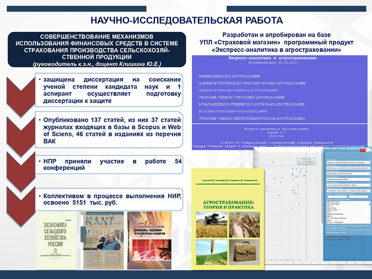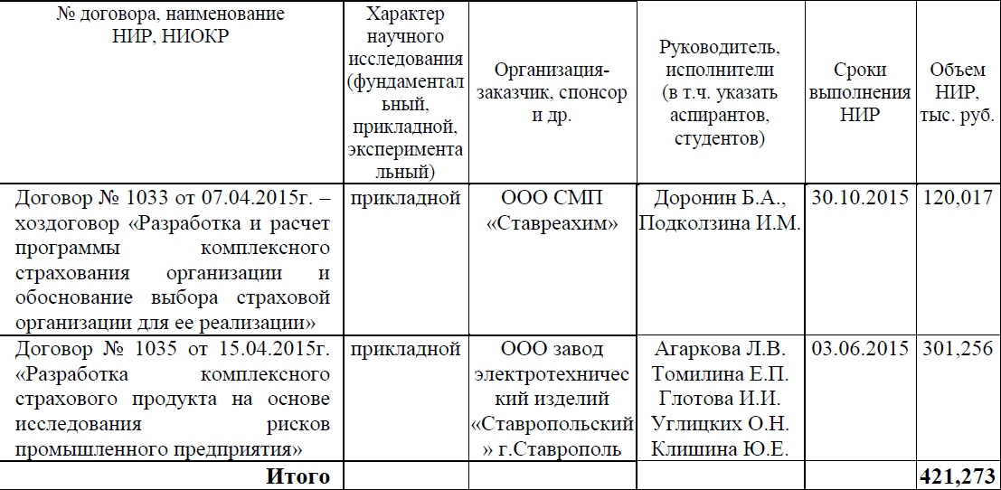 Заключен и реализован договор на создание научно-технической продукции с ООО завод электротехнический изделий «Ставропольский» № 1035 от 15.04.2015г. «Разработка комплексного страхового продукта на основе исследования рисков промышленного предприятия» (сумма 301 256 руб.)
