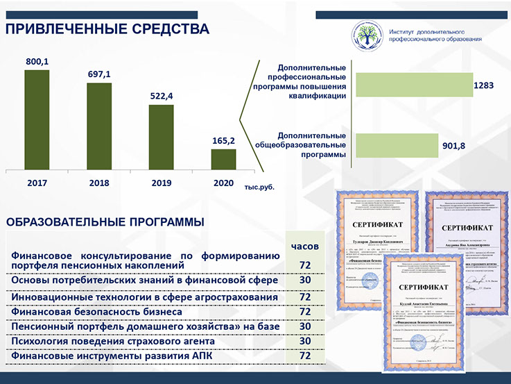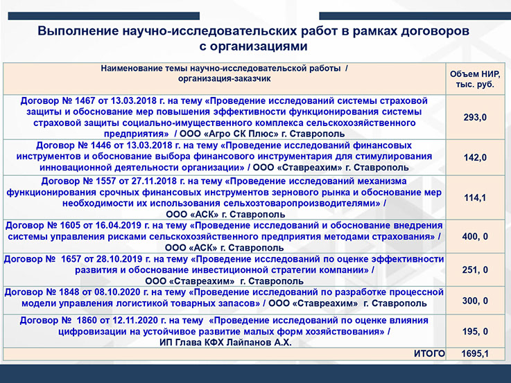 Хоздоговор № 1605 от 16.04.2019 г. с ООО «АСК» по теме «Проведение исследований и обоснование внедрения системы управления рисками сельскохозяйственного предприятия методами страхования». Сумма договора: 400 000 руб.